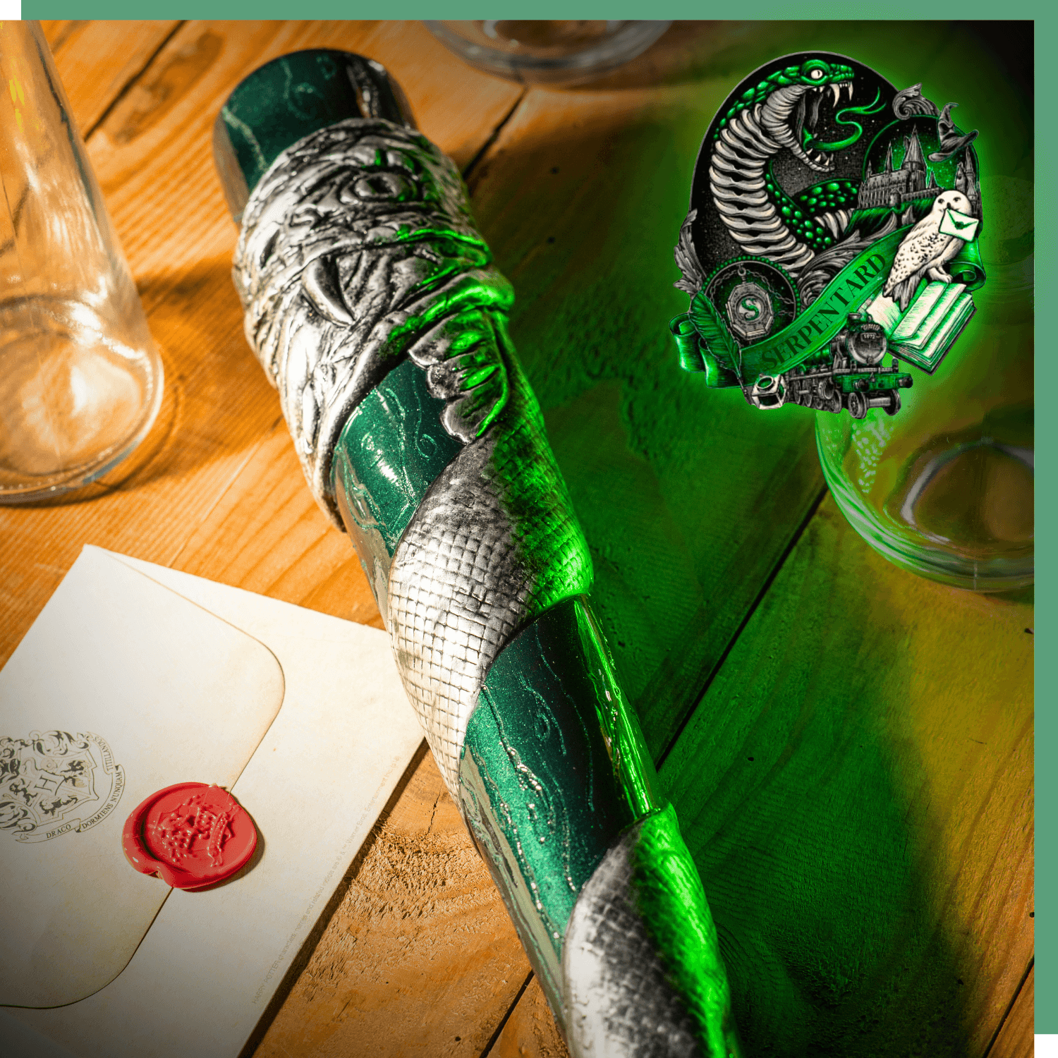Saisissez l'esprit de Serpentard avec cette batte minutieusement ouvragée. Teintée du vert emblématique et ornée de symboles argentés évoquant le serpent, cette batte célèbre la sagacité et l'ambition qui définissent les grands de cette maison. Parfaite pour ceux qui jouent aussi habilement sur le terrain qu'en dehors.